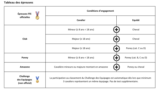 - Un équidé ne peut participer qu’à une seule épreuve (club, poney ou amazone) et avec un seul cavalier.