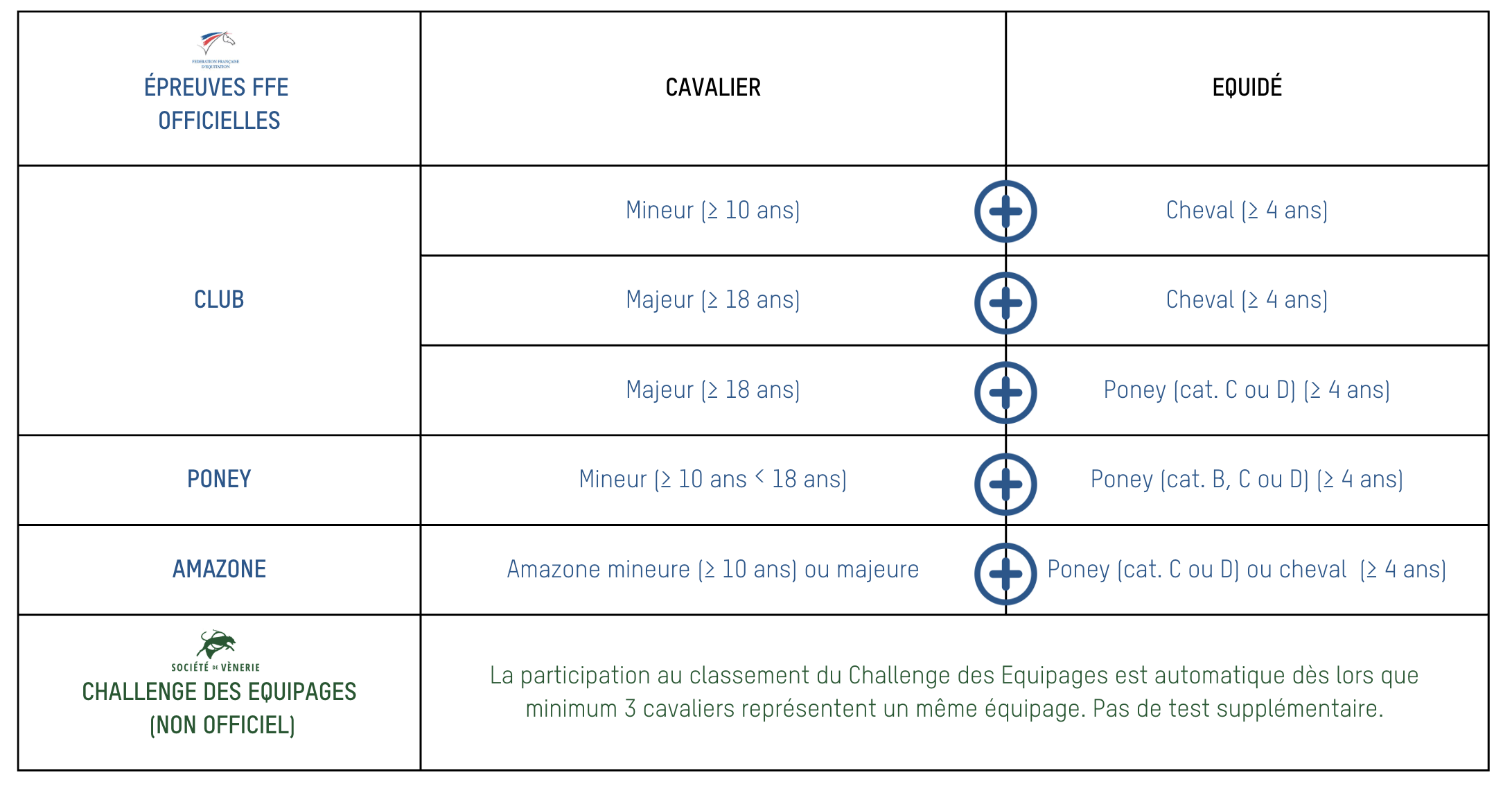 - Un équidé ne peut participer qu’à une seule épreuve (club, poney ou amazone) et avec un seul cavalier.